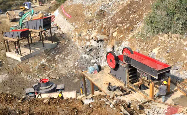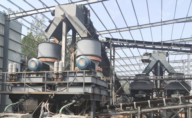 The rocks are harder because of there is iron ore inside. The project uses 600*130 vibrating feeder, PE1000*1200 jaw crusher, two HST300 single cylinder cone crusher two, two JYS1238 sand making machine, four vibrating screen, four sand washing machine, one sand recovery machine, capacity design is 300t/h.